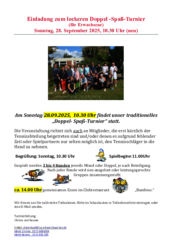 Am Sonntag, den 29.09.2024 um 11:00 Uhr wird dann schon der Abschluss der „Outdoor-Saison“ mit dem jährlich stattfindenden „Doppelspass-Turnier“ eingeläutet. Hier ist jede Spielstärke willkommen. Wie der Name schon sagt, soll der Spass im Vordergrund stehen. Wir wollen mit unseren Mitgliedern nochmal einen schönen Tag auf unserer Anlage verbringen und ein paar schöne Mixed-Runden spielen.